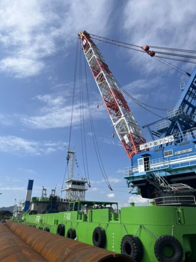 この船で沖に出て、岸壁や防波堤を作るのだそうです。