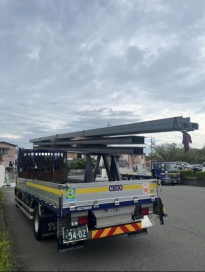 荷台が短いため、長物は車両頭の上にかけて運びます!